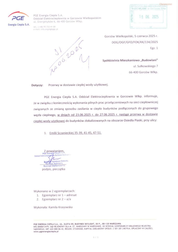 Przerwa w dostawie ciepłej wody użytkowej w dniach 23-27.06.2025 – os. Piaski